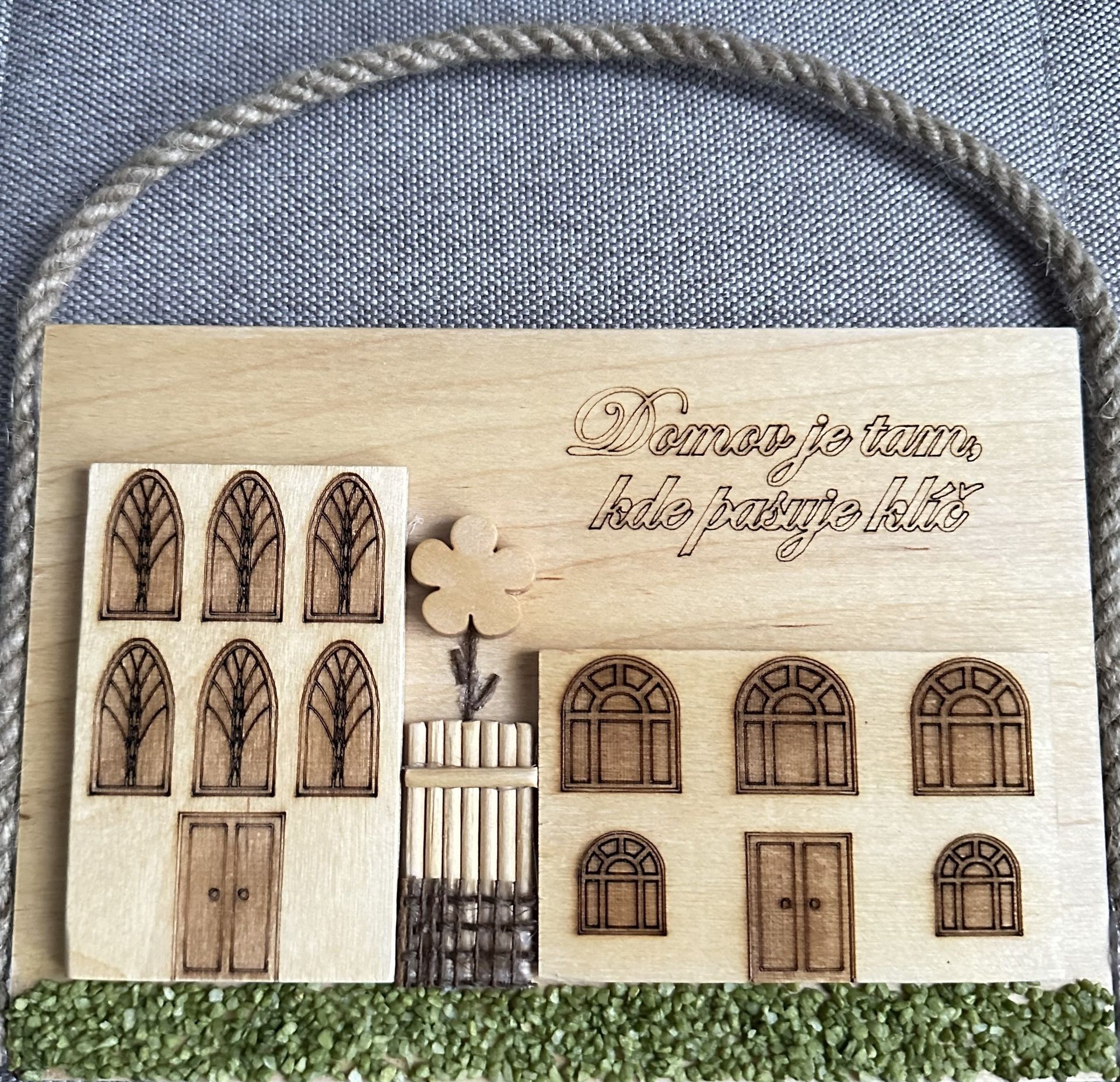 Ručně vyráběná dekorace z přírodních materiálů s gravírovaným nápisem ,,Domov je tanm, kde pasuje klíč."