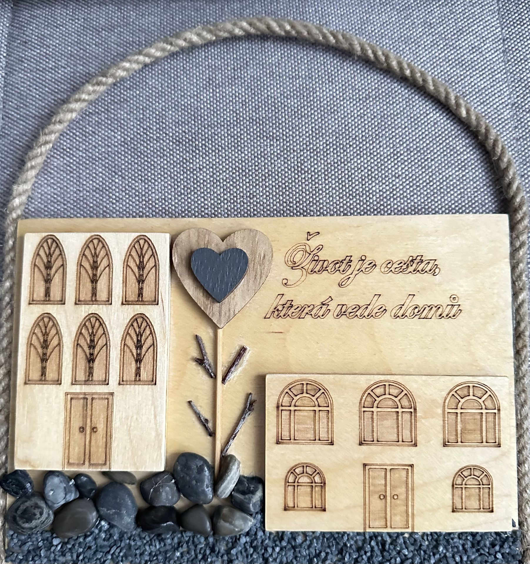 Domov je místo pro rodinu, lásku, pohodu a klid. V tomto duchu jsme vyrobili pár originálních kousků z přírodních materiálů jako je dřevo, kamínky a provázky. Gravírované citáty se váží na pohodu domova. Udělejte radost sobě nebo někomu blízkému. Dekorace je opatřena krouceným provázkem k zavěšení.
