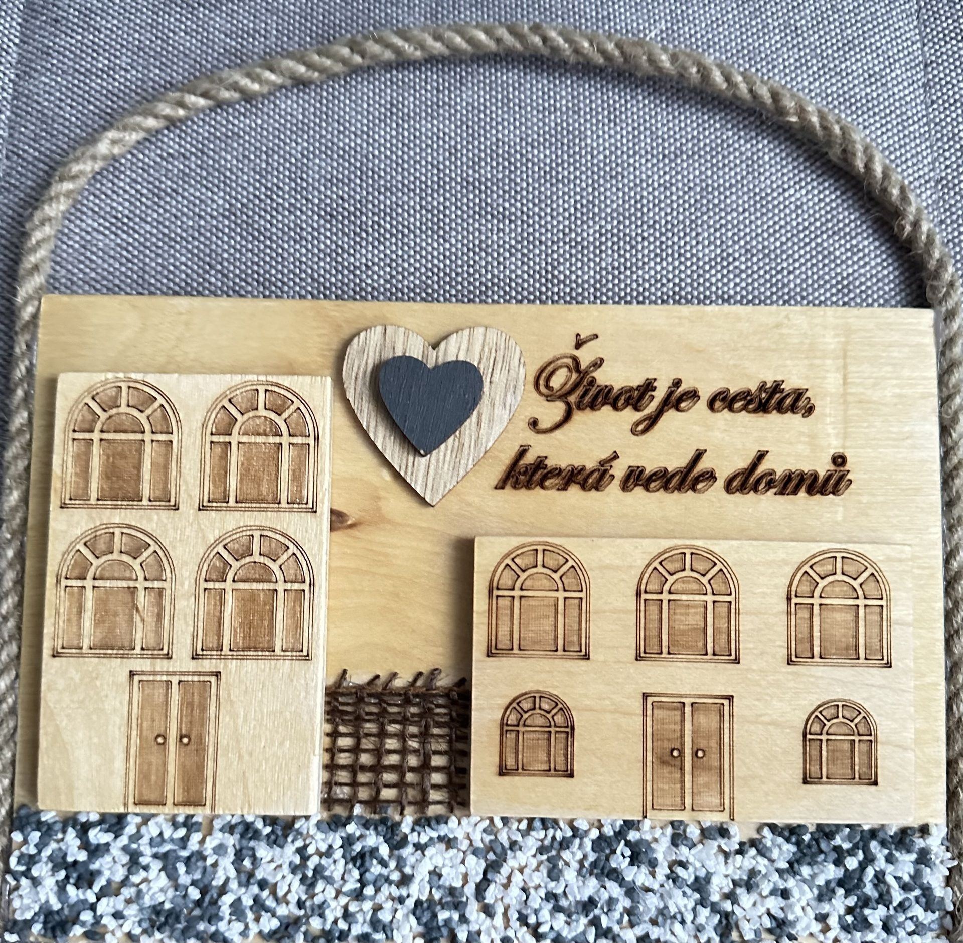 Domov je místo pro rodinu, lásku, pohodu a klid. V tomto duchu jsme vyrobili pár originálních kousků z přírodních materiálů jako je dřevo, kamínky a provázky. Gravírované citáty se váží na pohodu domova. Udělejte radost sobě nebo někomu blízkému. Dekorace je opatřena krouceným provázkem k zavěšení.