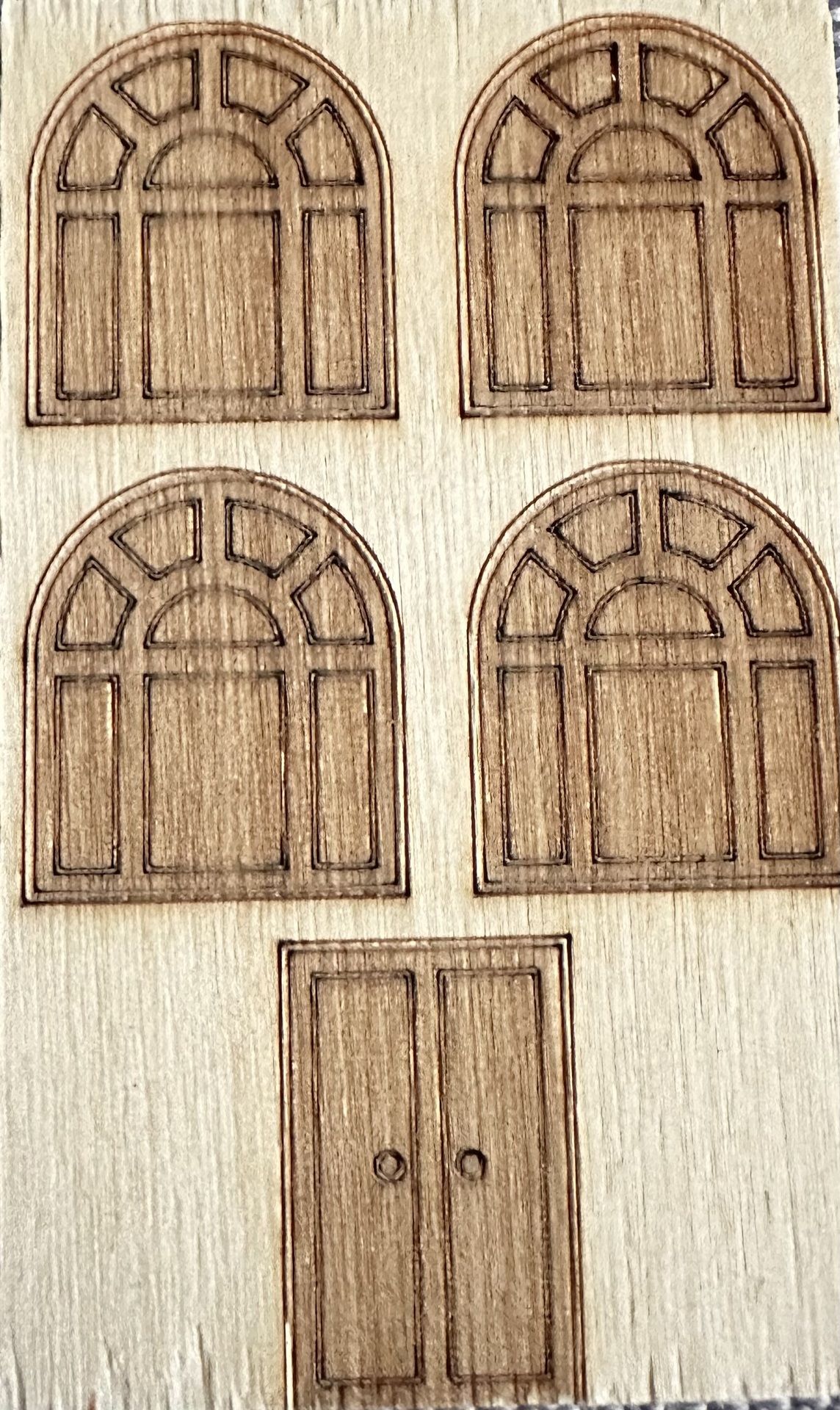 Dřevěná destička s gravírovanými okénky a dveřmi určená pro kreativní tvoření ze dřeva.