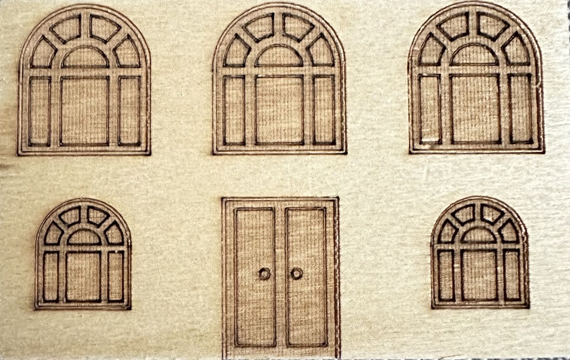 Dřevěná destička s gravírovanými okénky a dveřmi určená pro kreativní tvoření ze dřeva.
