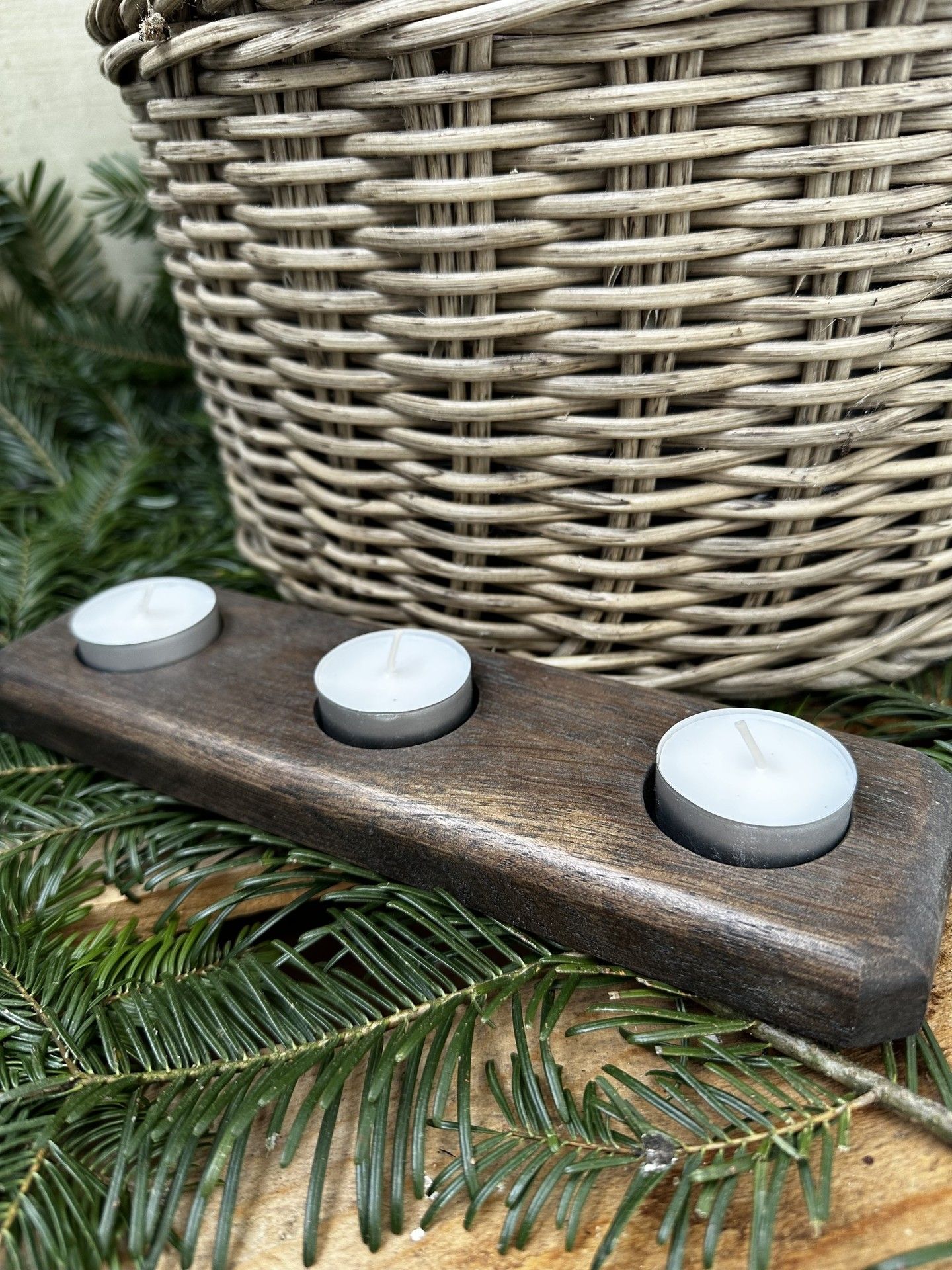 Dřevěný svícen na tři čajové svíčky pro celoroční použití. Vykouzlete romantickou atmosféru při svíčkách kdykoliv během roku.