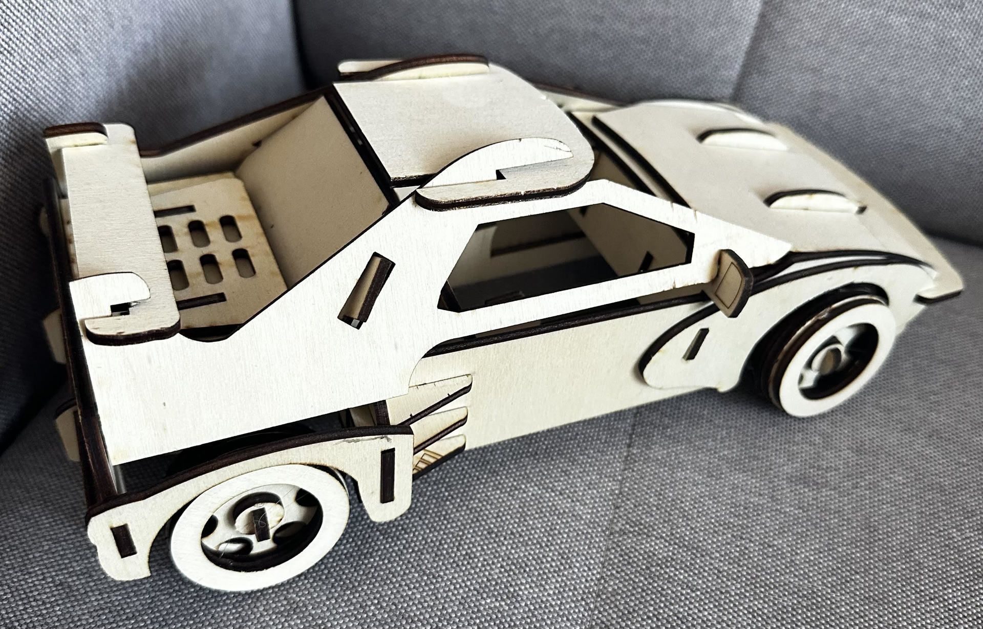 Zábavná skládačka pro děti i dospělé, dárek i dekorace. To je originální dřevěný 3D model závodního auta.